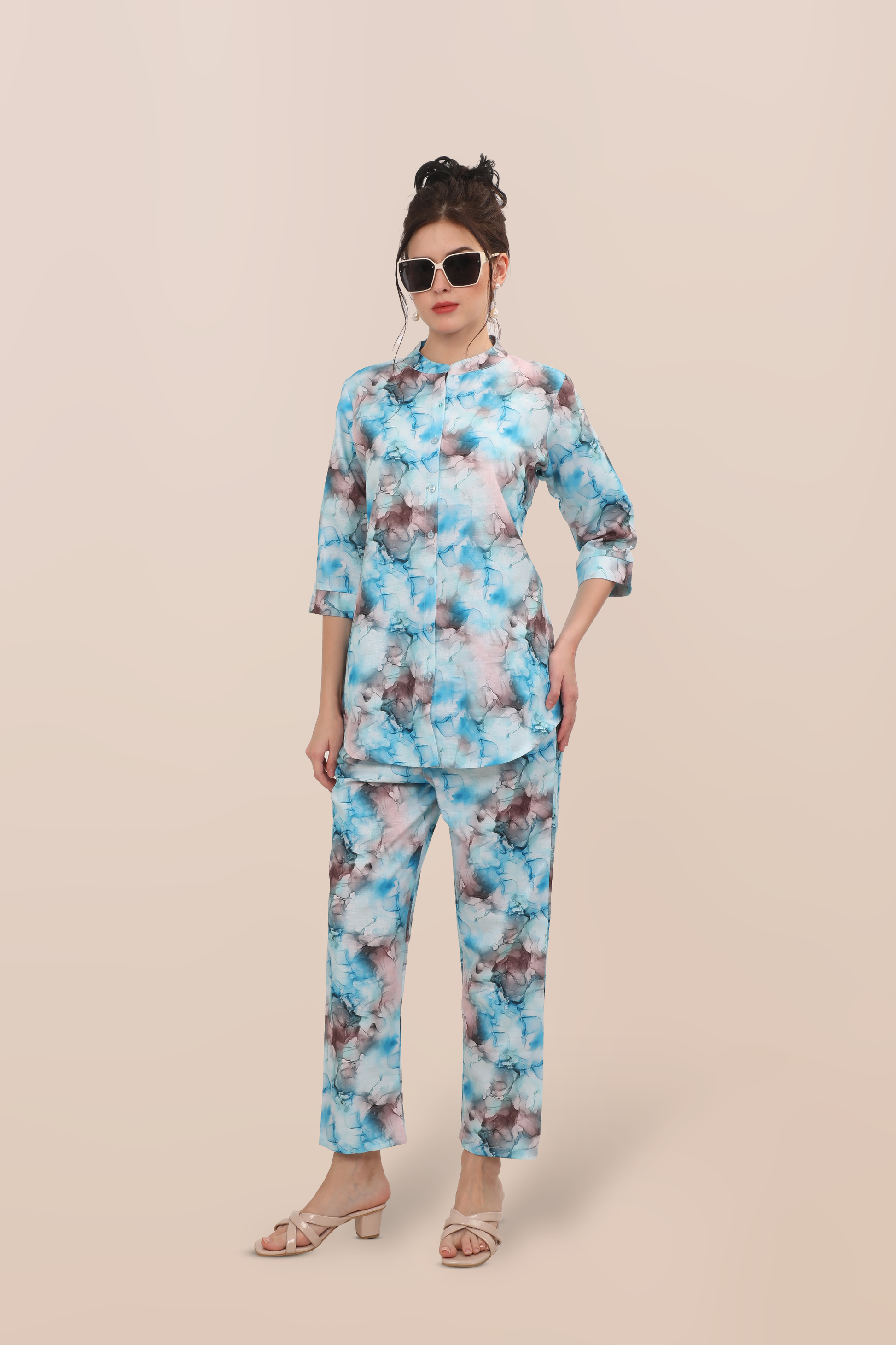 Dive into dreamy comfort with this watercolor-inspired co-ord in soothing blues and blush tones. With a mandarin collar, airy silhouette, and effortless vibe—it’s your go-to for days that flow as beautifully as you do.