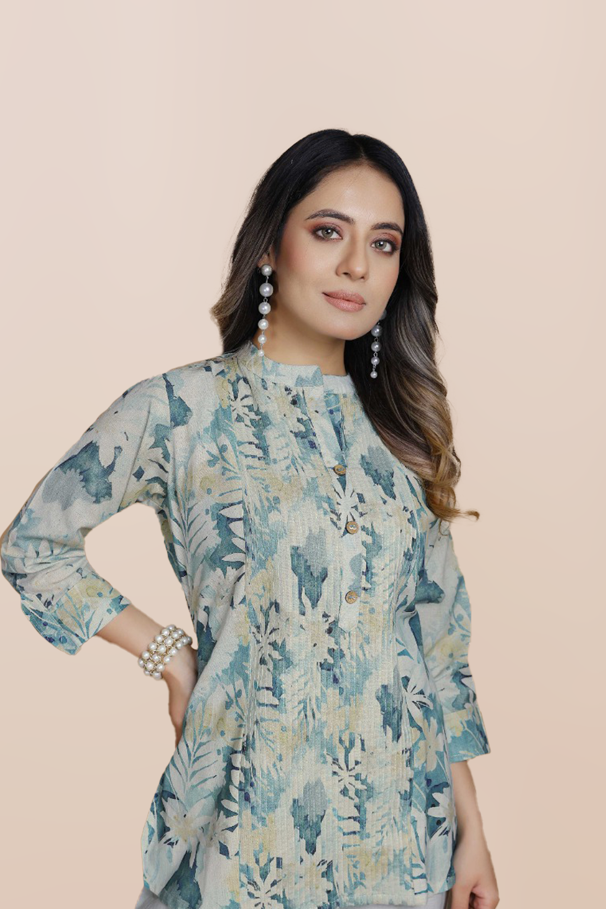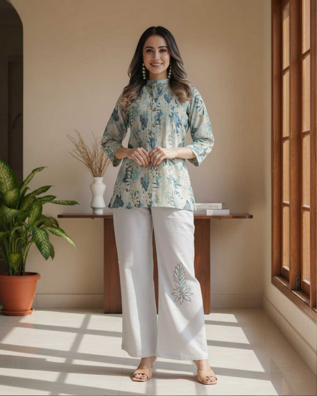 Step into serene sophistication with this Blue Meadow Breeze Co-ord Set. The floral-printed kurta in calming shades of blue and beige is paired with wide-legged trousers featuring an elegant embroidered botanical motif. Crafted for comfort and style, this set is perfect for both daytime elegance and evening charm.