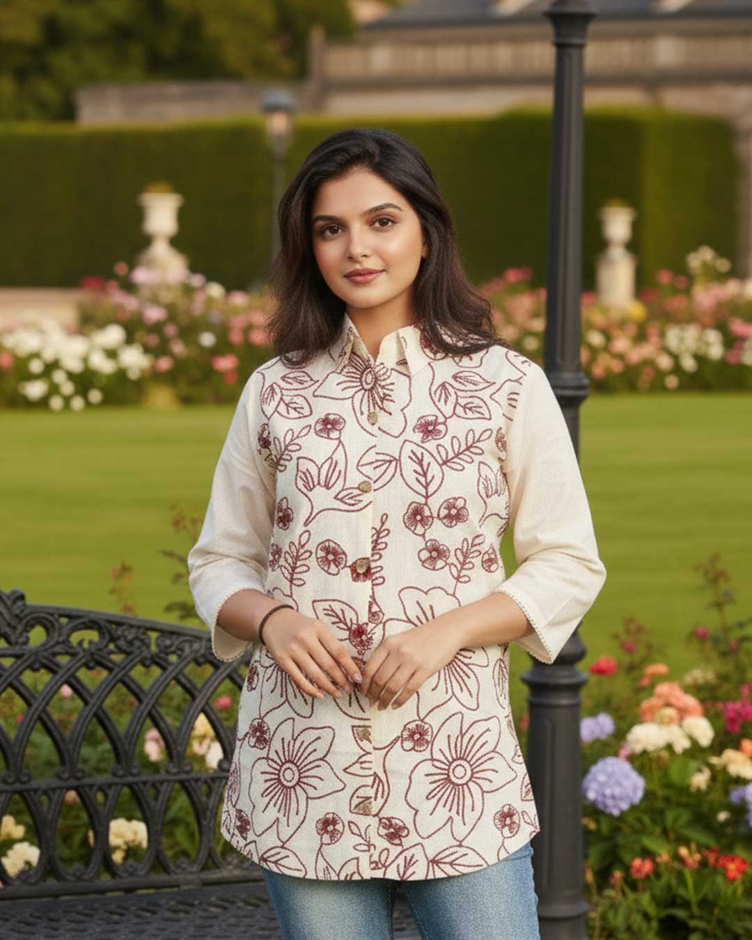 Add a touch of elegance to your wardrobe with the Embroidered Crimson Bloom Pointed Collar Top. This cream-colored shirt features full-front embroidery in a rich maroon floral and leaf pattern, creating a striking yet graceful contrast. Designed with 3/4th sleeves, wooden buttons, and a soft collared neckline, it’s perfect for both casual outings and semi-formal occasions. The lightweight fabric ensures all-day comfort, while the intricate design adds a chic, artisanal flair to your ensemble.