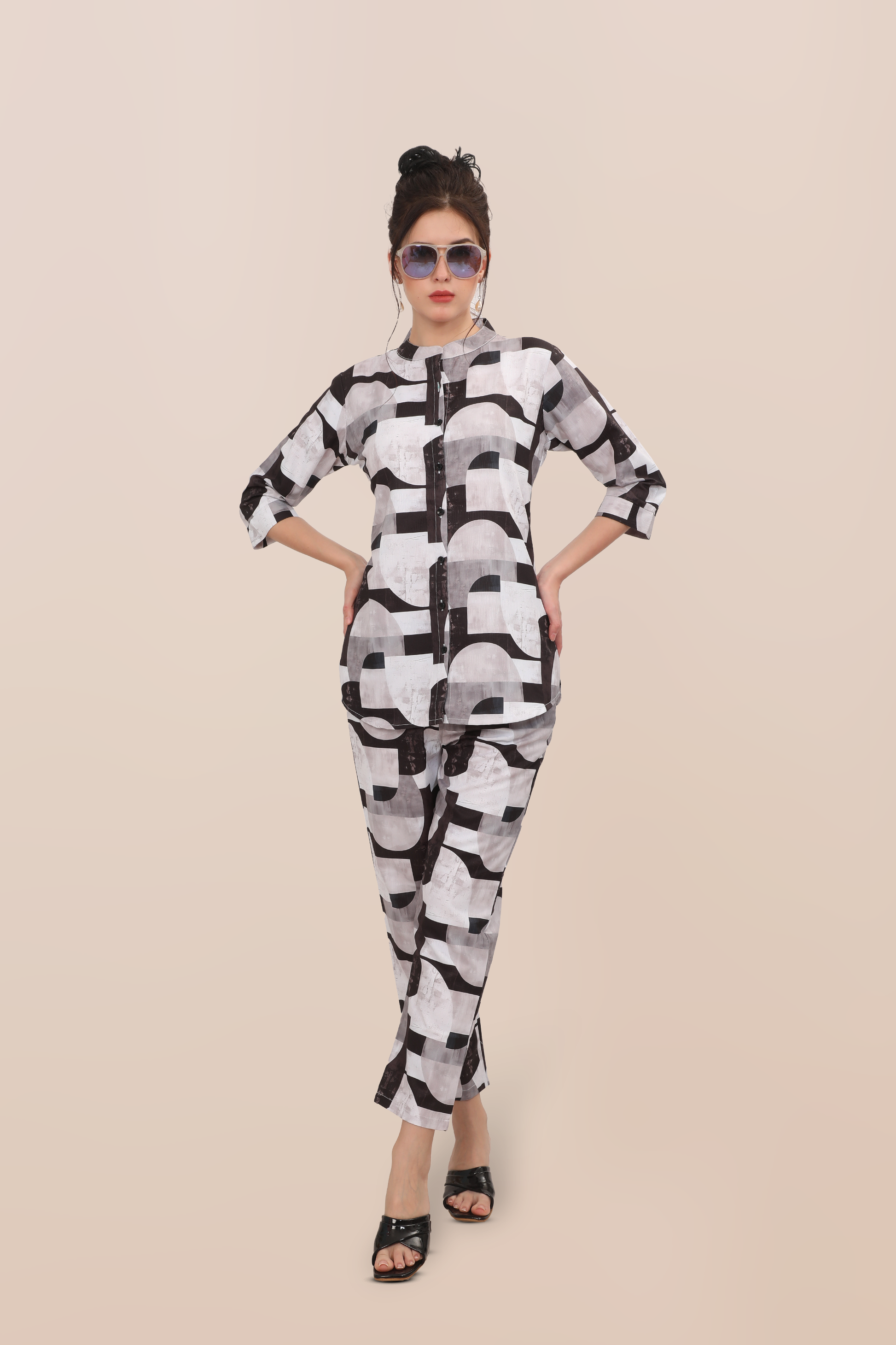Sleek, structured, and striking—this black-and-white geometric co-ord brings graphic flair to your everyday. With a smart mandarin collar and effortless fit, it’s your go-to for edgy elegance and all-day comfort.