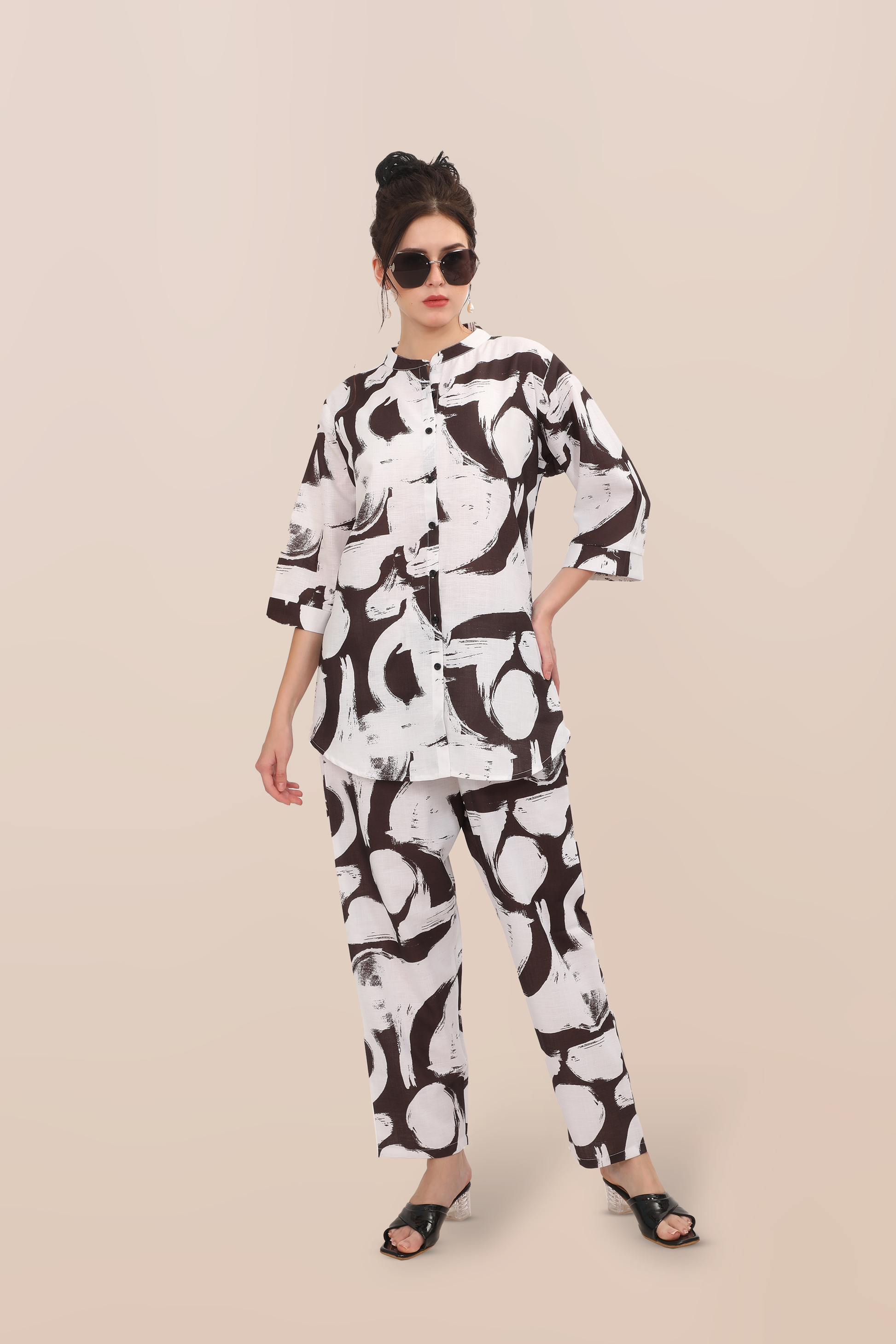 A canvas of bold brushstrokes and effortless attitude. This black-and-white co-ord makes modern art wearable—featuring a mandarin collar, easy silhouette, and an unapologetic flair that moves with you.
