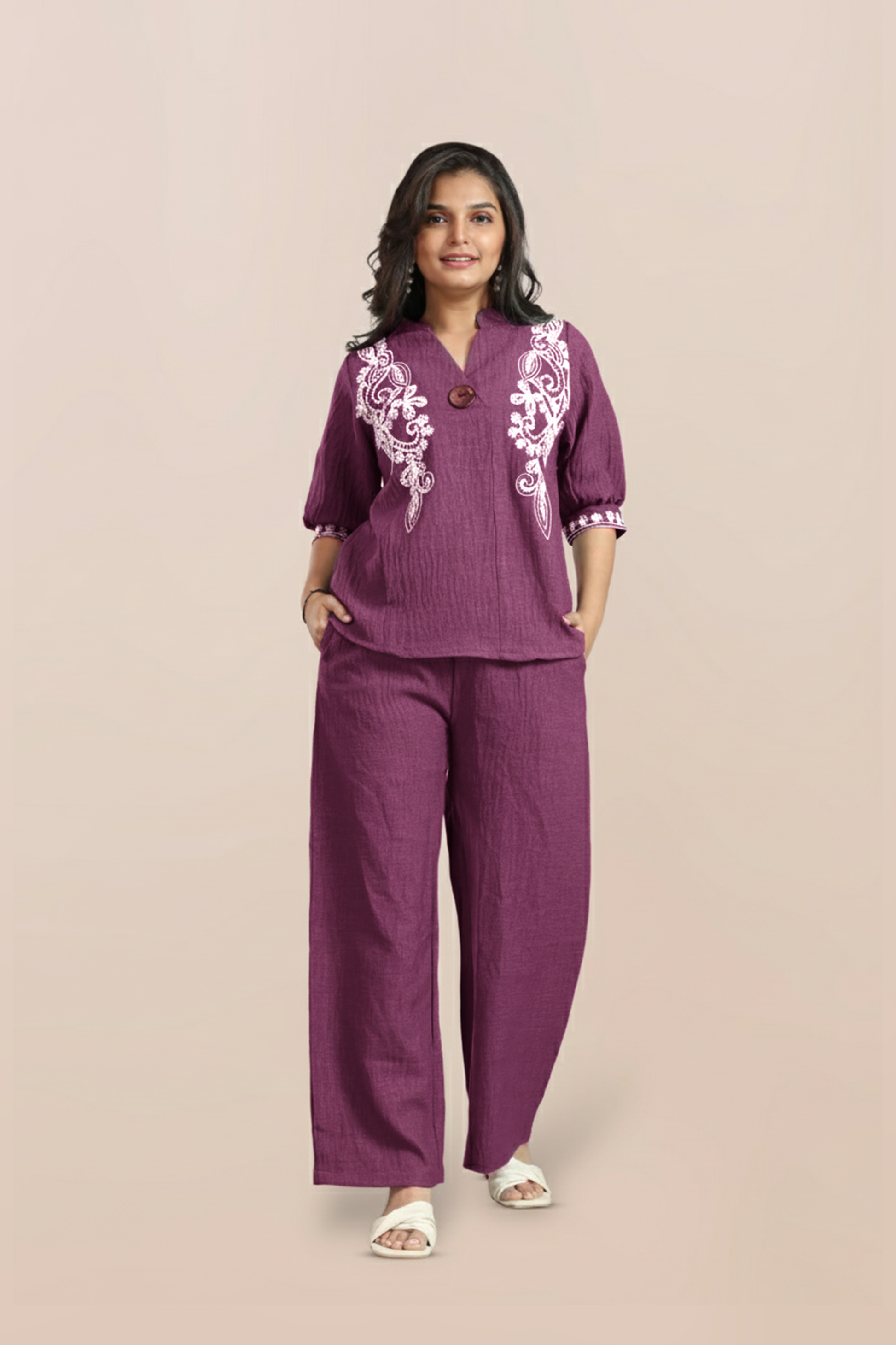 The Bloom Co-ord Set blends grace and ease in a silhouette that feels just as good as it looks. Crafted from a breezy, textured fabric, this set features a relaxed-fit top with intricate white thread embroidery across the shoulders—delicate paisley and floral patterns that nod to timeless Indian artistry. A single handcrafted button at the neckline adds rustic charm.