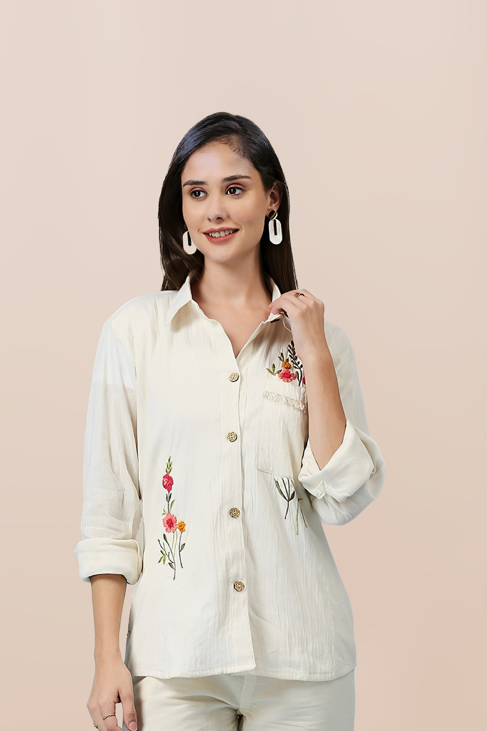 Top: Collarless V-neck, full sleeves, geometric panel detailing