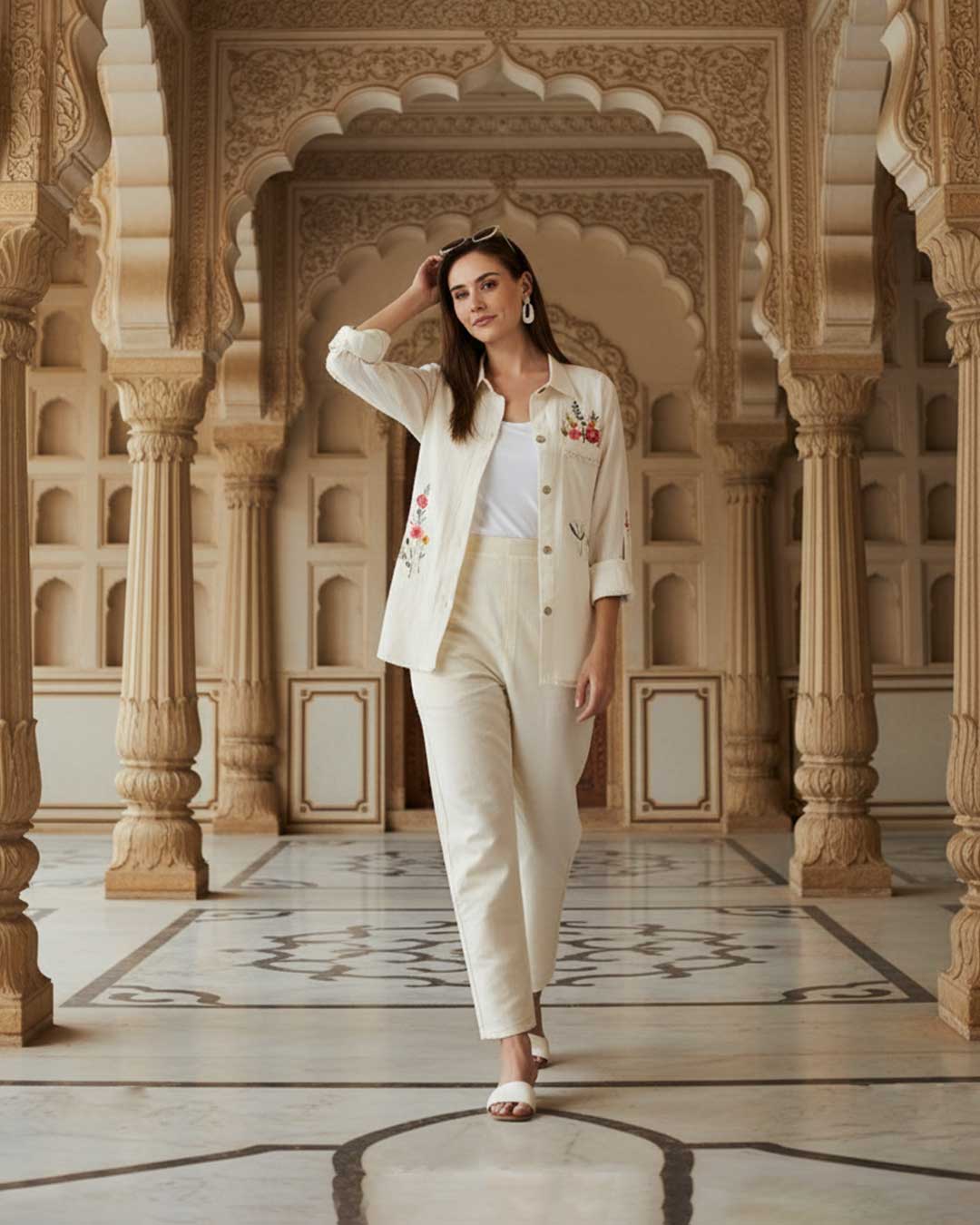 Sleek, sharp, and expertly layered, Precision Edge is all about clean geometry. The kurta features intricate panel embroidery in tonal threads, mimicking layered architectural grids. The collarless neckline gives it a modern minimalist look, while the slim tapered trousers ensure a neat, runway-ready.