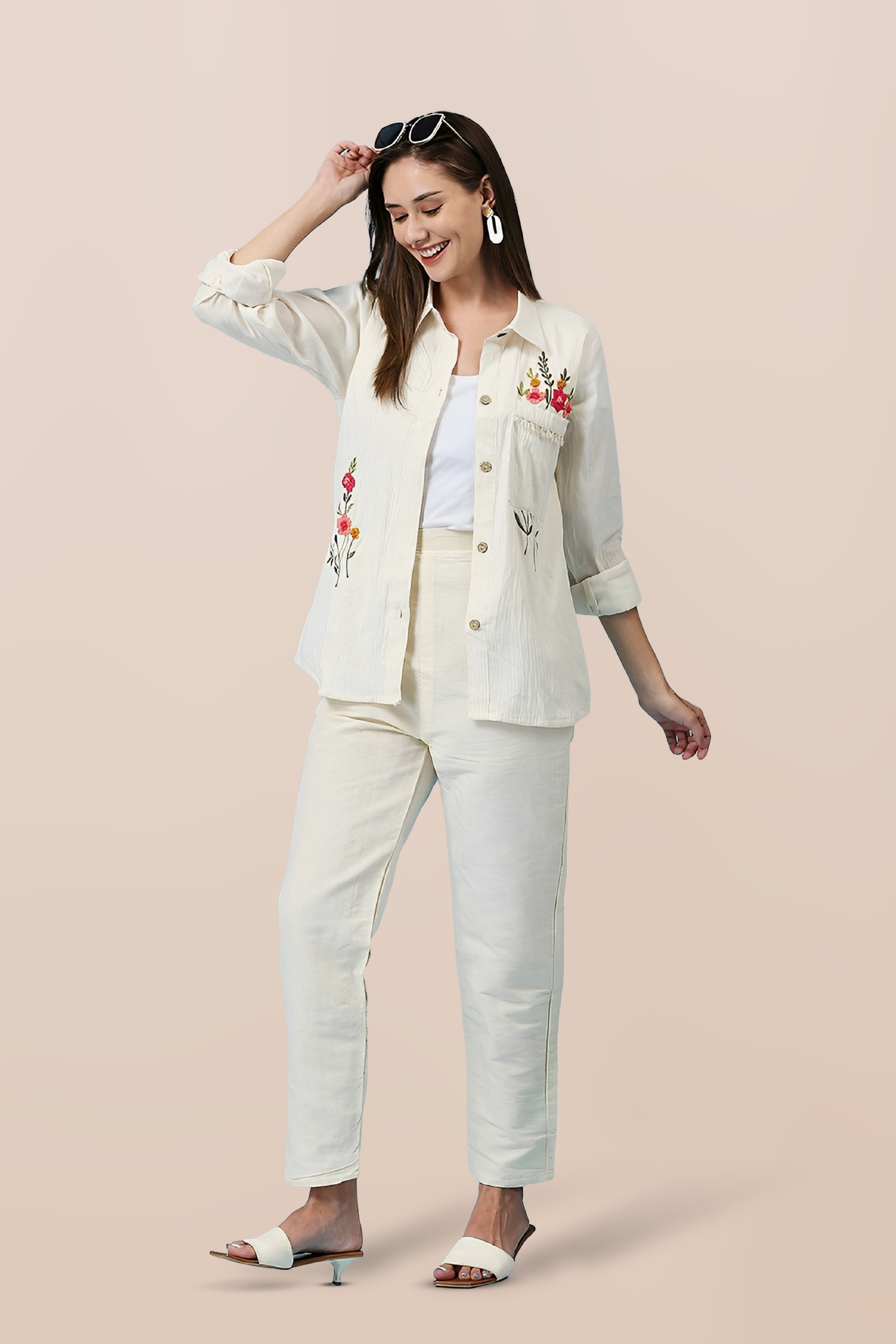 Top: Collarless V-neck, full sleeves, geometric panel detailing